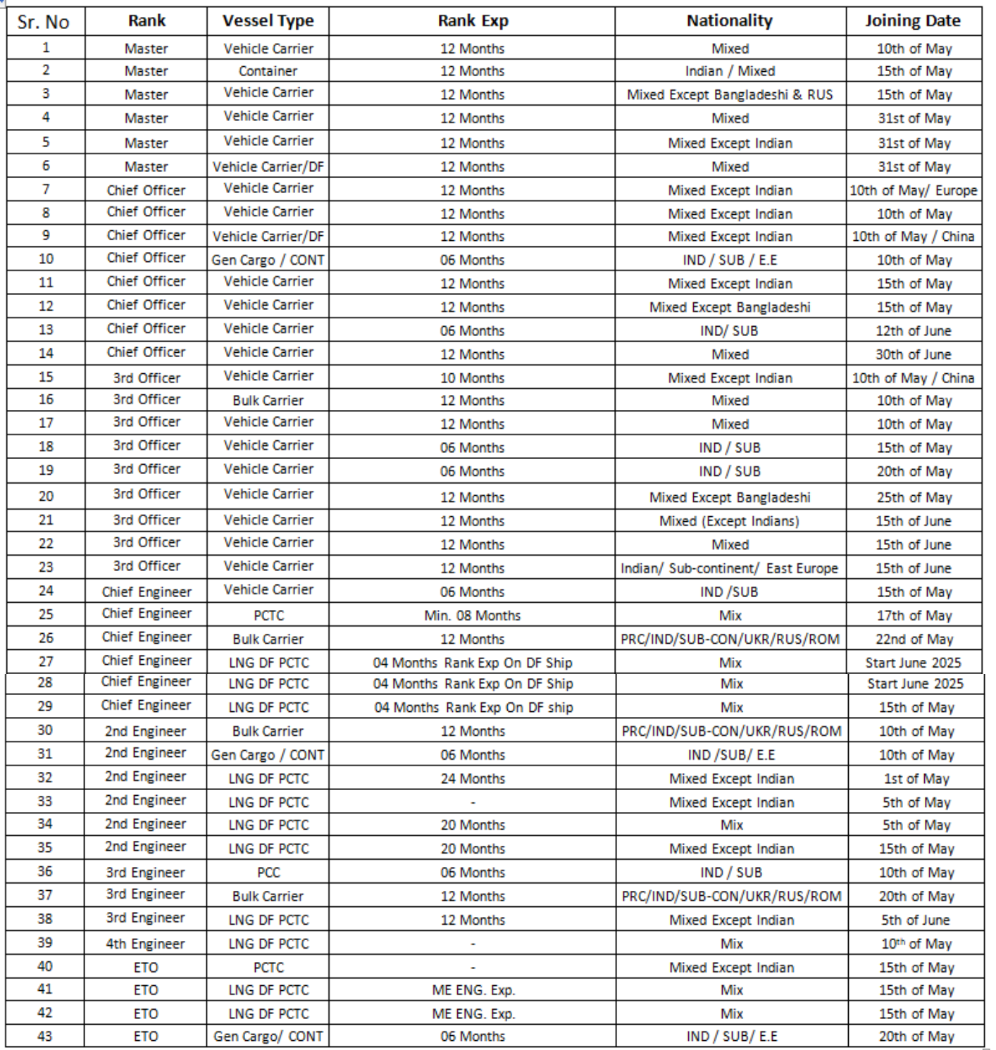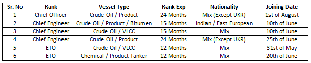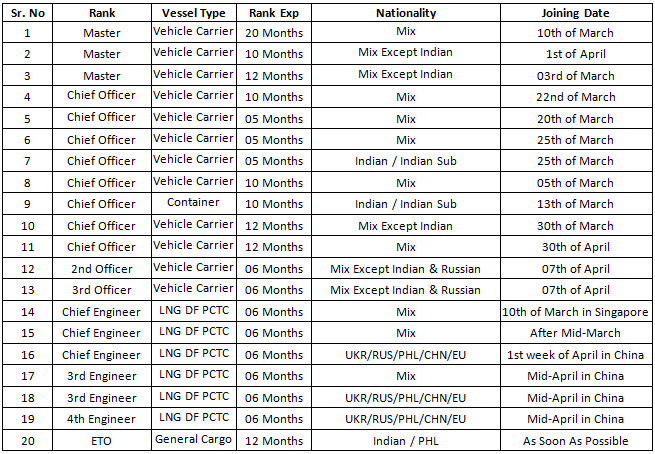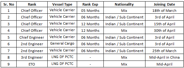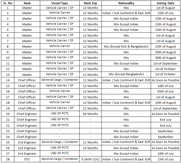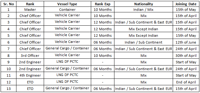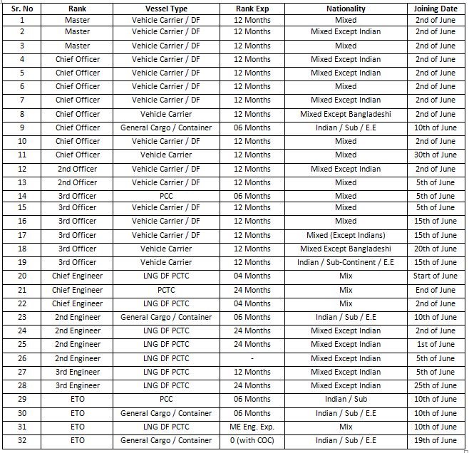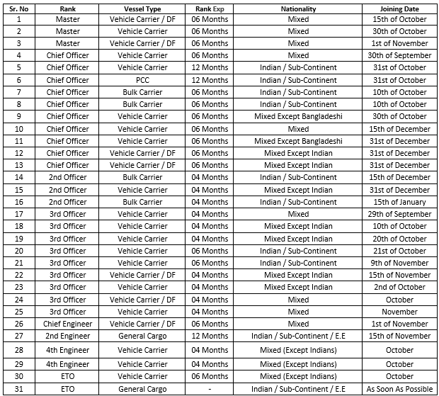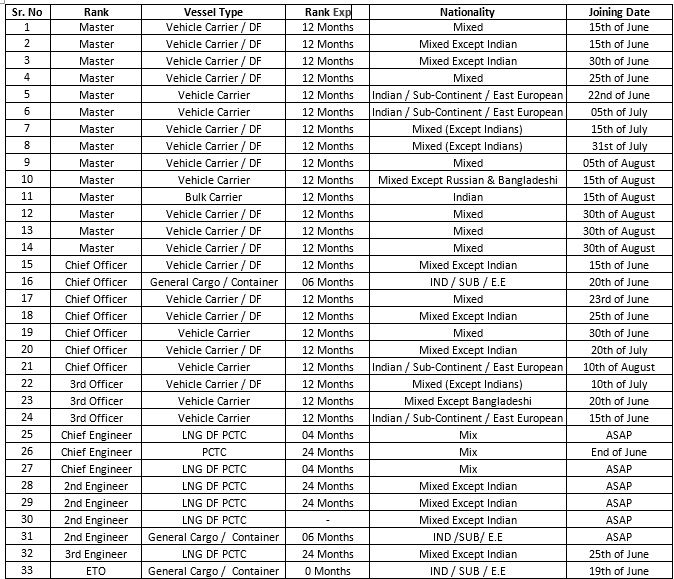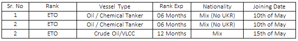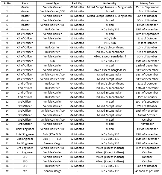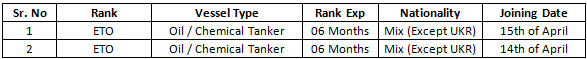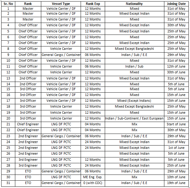 Urgently required following Sea Staff (EX - NITC) in order to join following vessels and place around mentioned date.