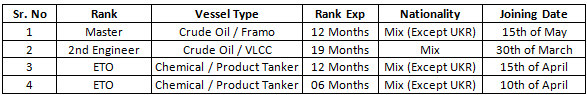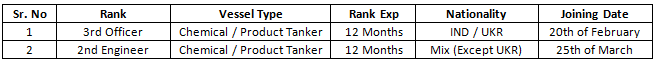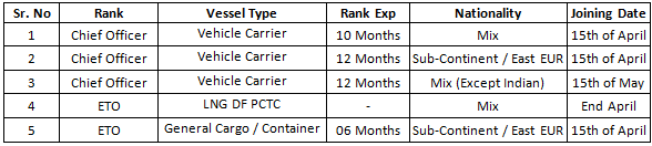 5. MT ANGLEVIKEN : Joining in January, 2018. Minimum 33 months rank experience. Should be East European.