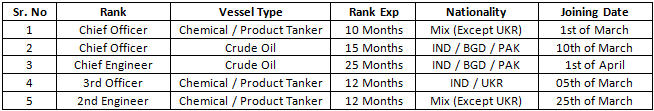 One of our Principal urgently require the following ranks for Suezmax Oil Tanker.