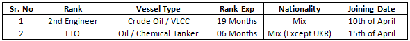 The critical ranks that we need are Second Engineer, ETO , Third Officers and Second Officer with crude oil tanker experience.