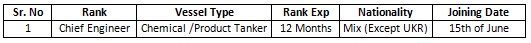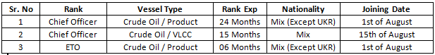 One of our Principal urgently require the following rank for MR Size Oil Product Tanker.