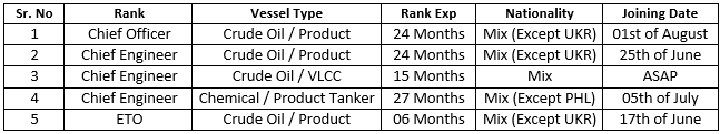 Our Principals urgently require the following ranks for their Tanker and Dry Fleet.