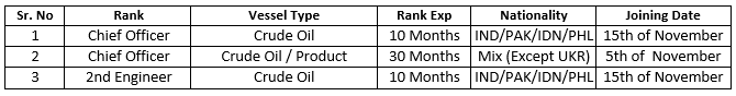 1. MT HAFNIA LUPUS : Joining around Mid November, 2017. Minimum rank experience to be 30 months.