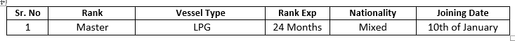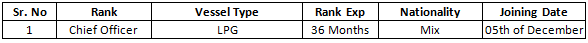 One of our Principals require Junior Officer & Junior Engineer for LPG Carrier. Candidate must have LPG Carrier experienced.