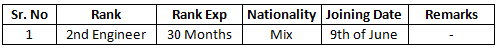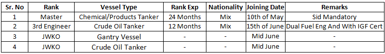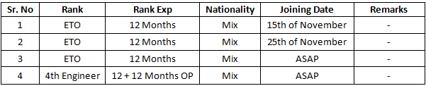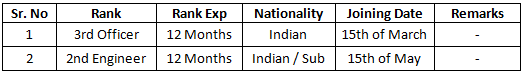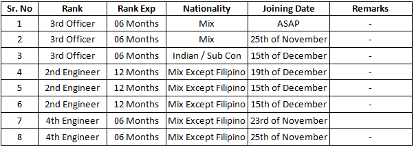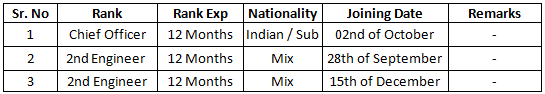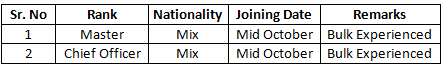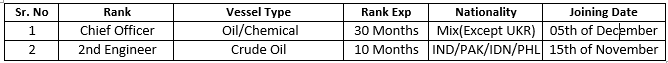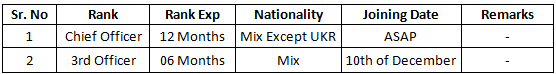 2. MT STAVANGER BLOSSOM : Joining in December, 2017. Minimum rank experience to be 20 months.
