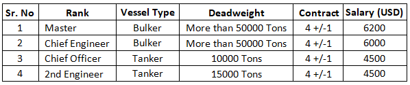 Urgently required following Sea Staff for Tanker, Bulk Carrier, Livestock Carrier and Container Vessel.
