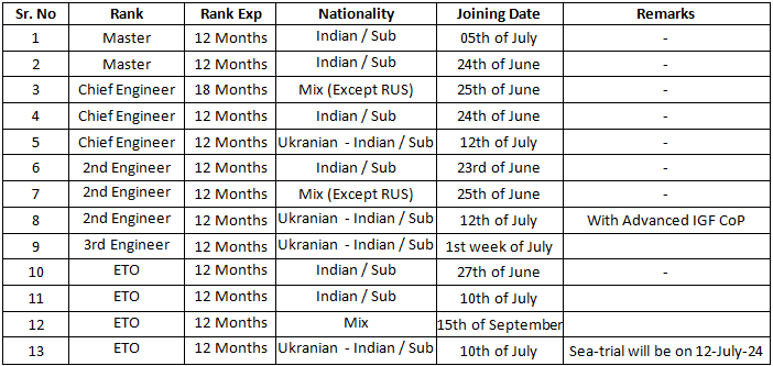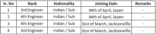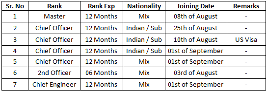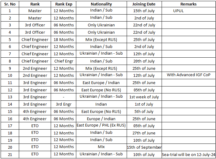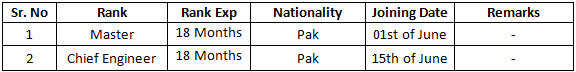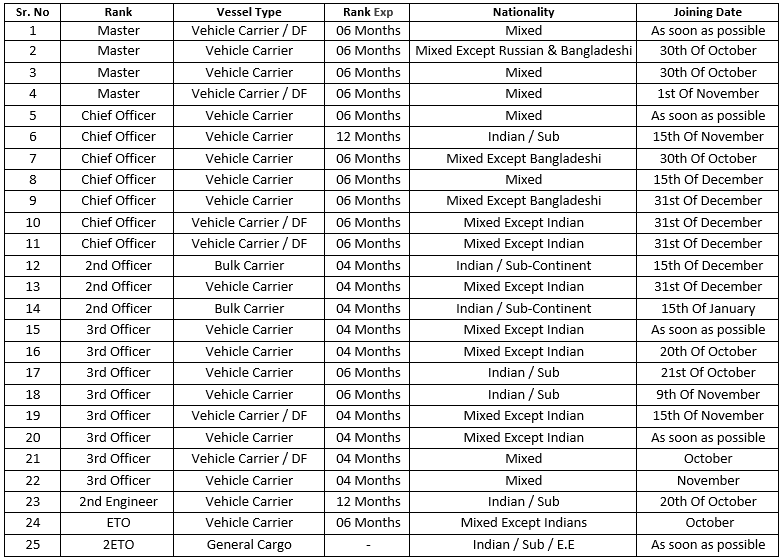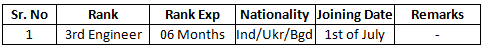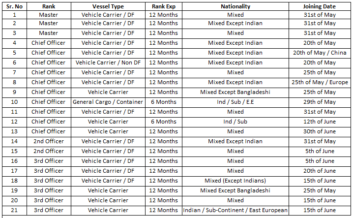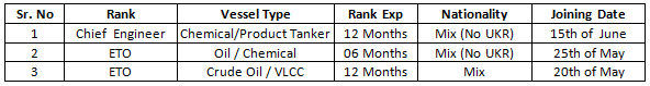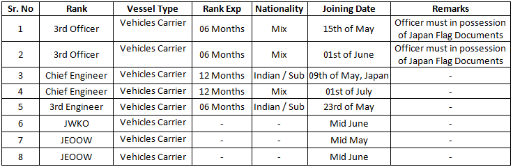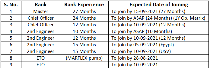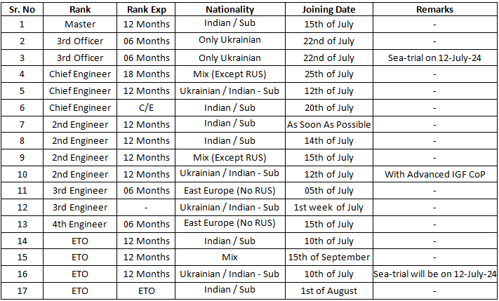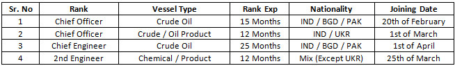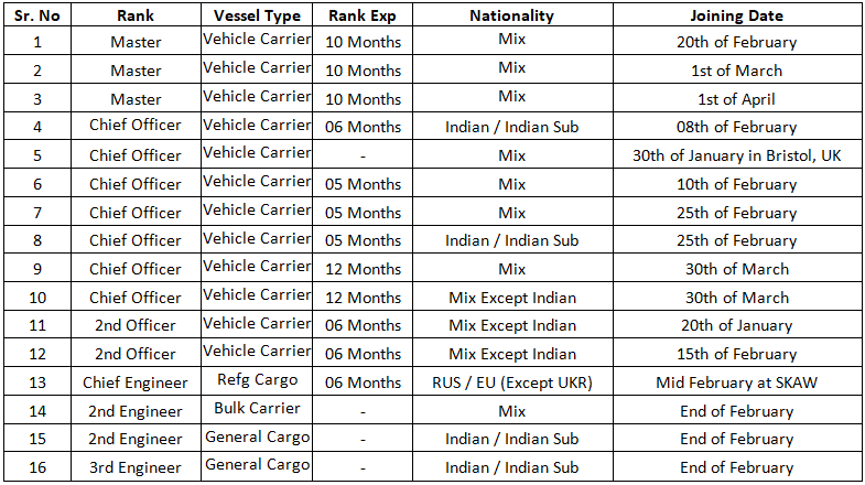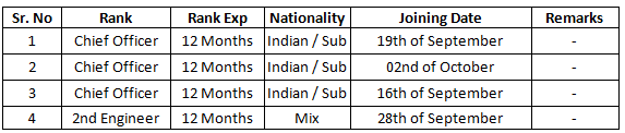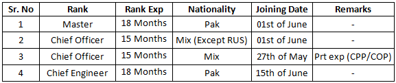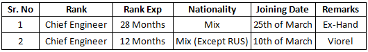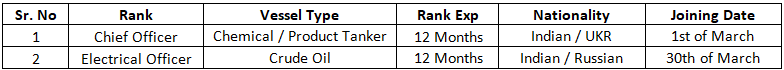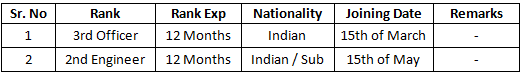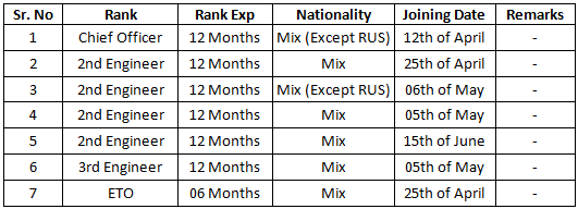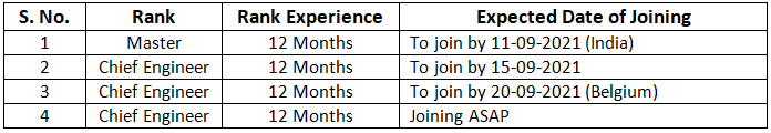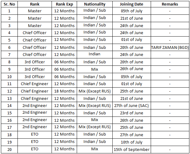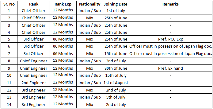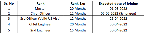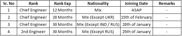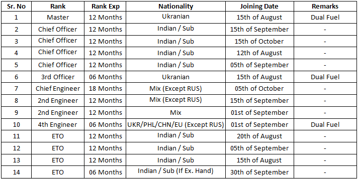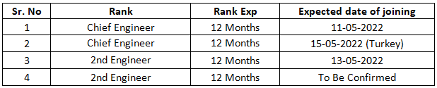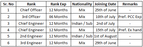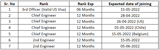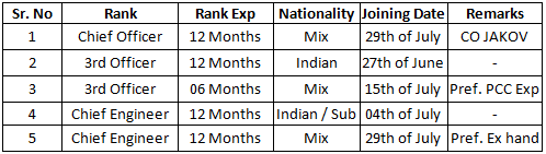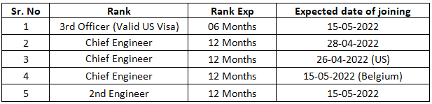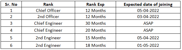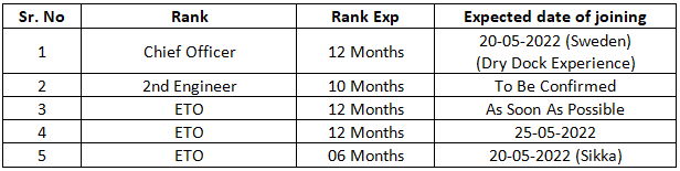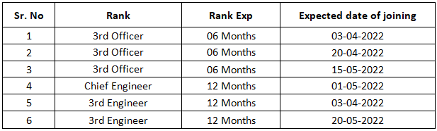 Urgently required following Sea Staff (EX - NITC) in order to join following vessels and place around mentioned date.