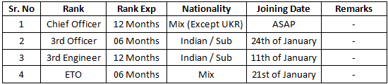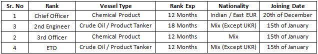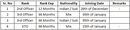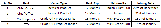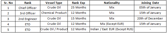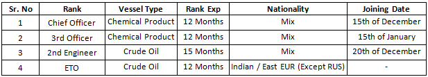 4. MT Angleviken : Chief Officer to join by end January, 2018 (Minimum rank experience to be 33 months).