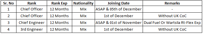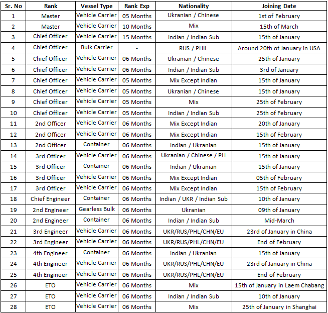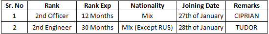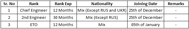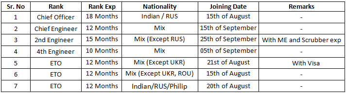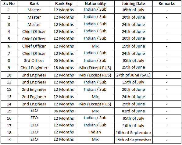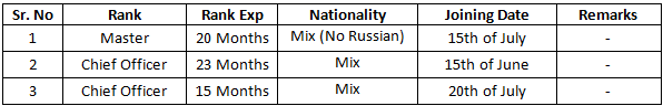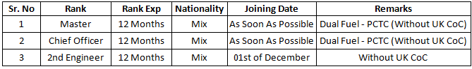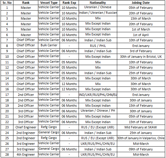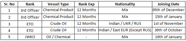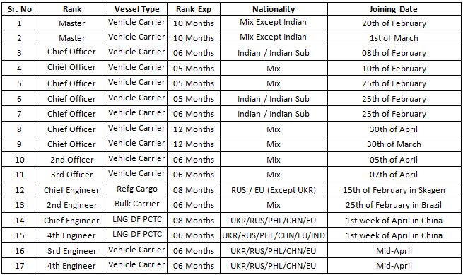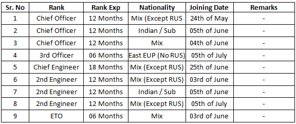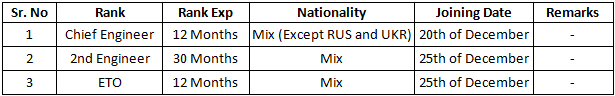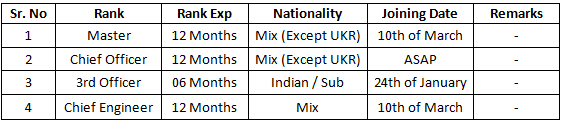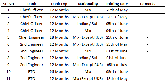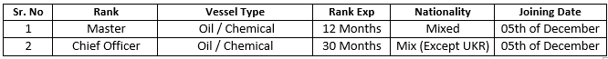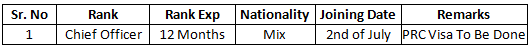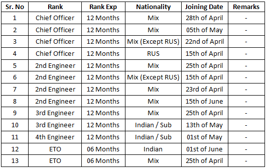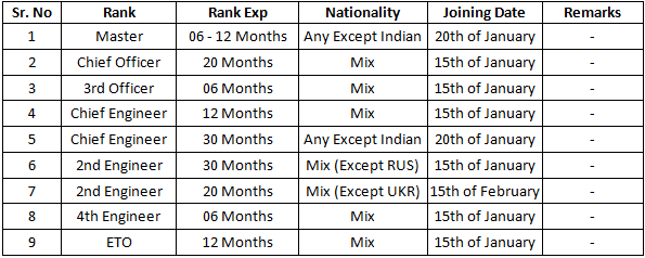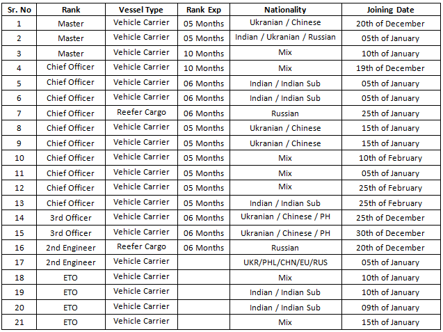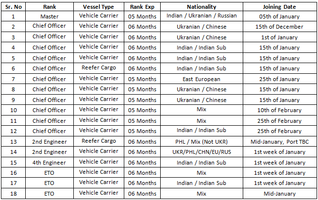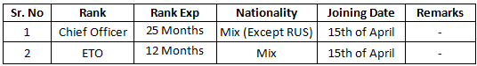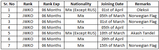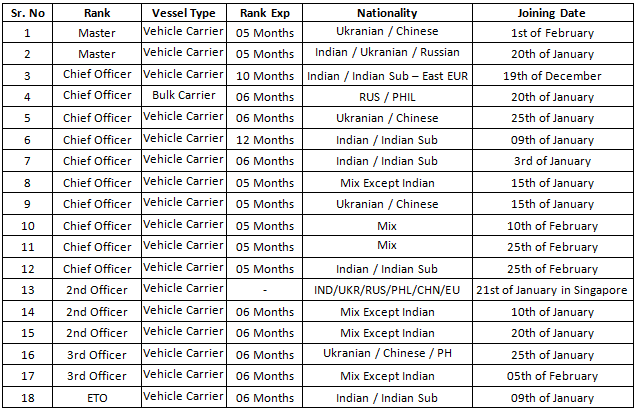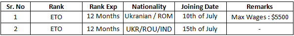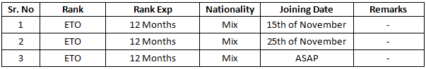 5. MT ANGLEVIKEN : Joining in January, 2018. Minimum 33 months rank experience. Should be East European.