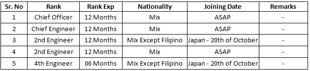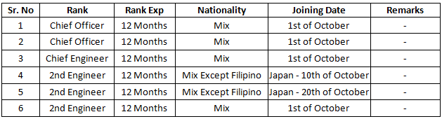 One of our foreign Principals “Wallem Ship Management” is looking for the following ranks for their new building vessels.