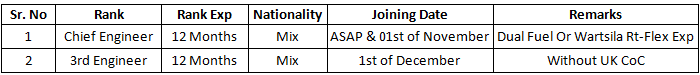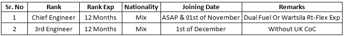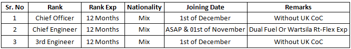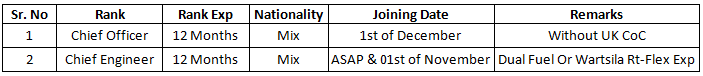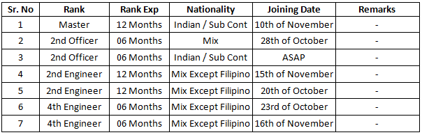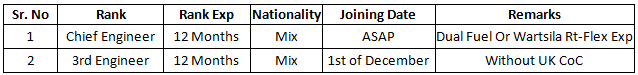 1. MT ATLANATIC DAWN : Sulzer Engine joining around End October, 2017. Minimum 15 months rank experience. Should have Sulzer engine experience.