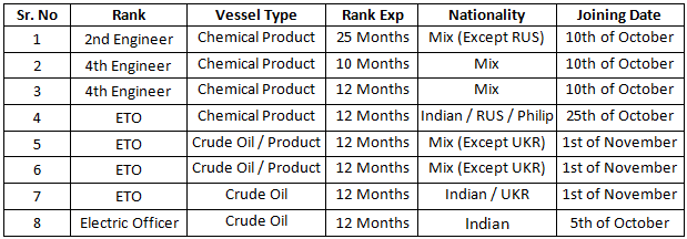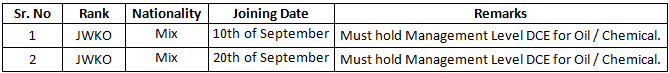 2. MT V.K.EDDIE : VLCC joining around End October, 2017. Minimum 33 months rank experience.