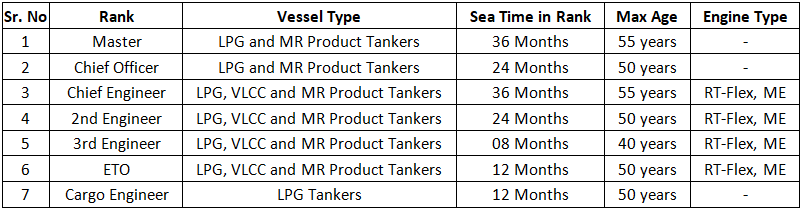 Candidates must have minimum 12~15 months experience in Rank, on the Tanker