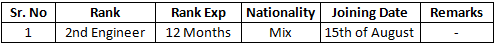 1. 2nd Engineer : TBA. Will need Ex Wallem 2nd Engineer with 1 year 6 months operator experience. Minimum 10 months rank experience.