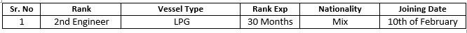 One of our Principals require Junior Officer & Junior Engineer for LPG Carrier. Candidate must have LPG Carrier experienced.