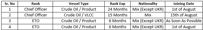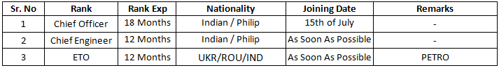 The critical ranks that we need are Second Engineer, ETO , Third Officers and Second Officer with crude oil tanker experience.