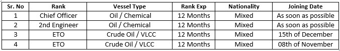 One of our Principal urgently require the following rank for MR Size Oil/Chemical Tanker.