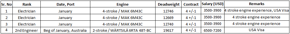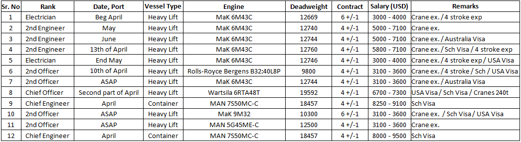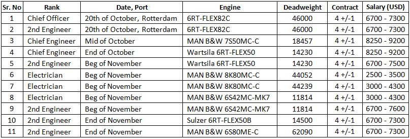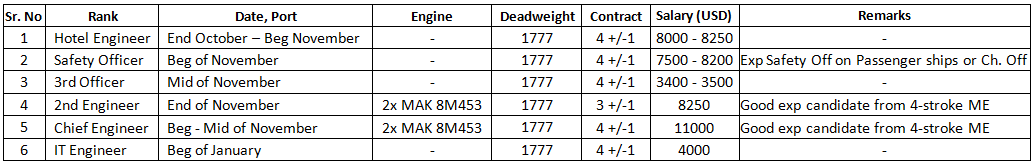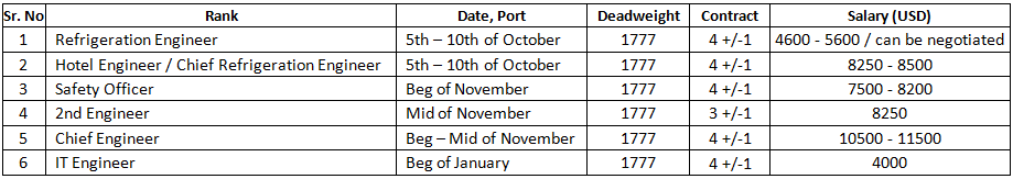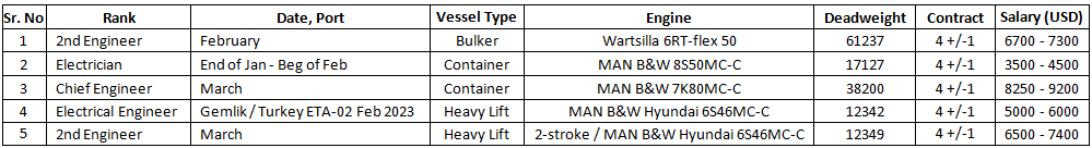 Crew in Engine dep. – Chief Engineers, 2nd Engineers, 3rd Engineers, Electrician.