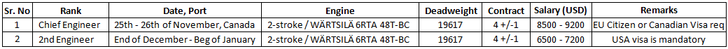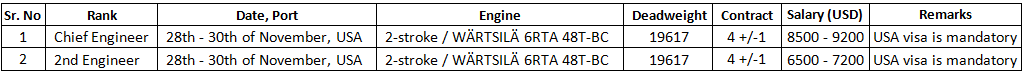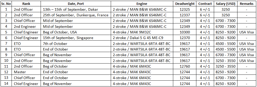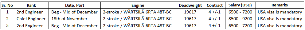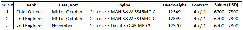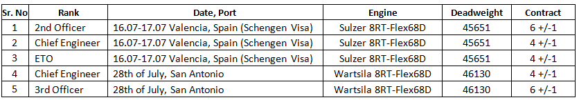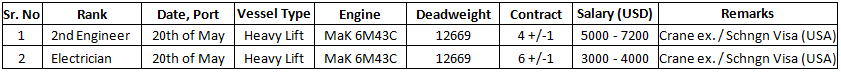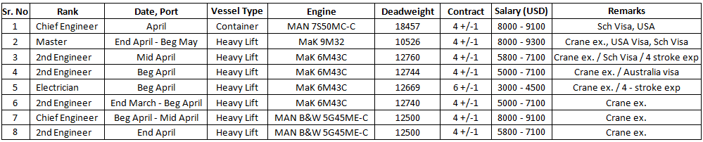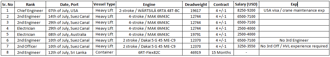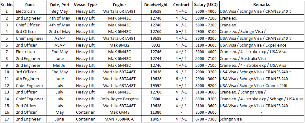 Nordic Hamburg urgently requires the following ranks for Heavy Lift Vessels. USA Visa is mandatory.