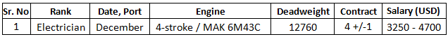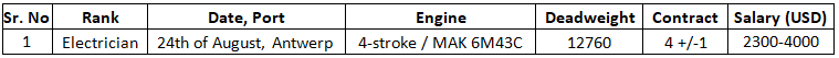 Nordic Hamburg urgently requires good and experienced Electrician for Heavy Lift Vessels.